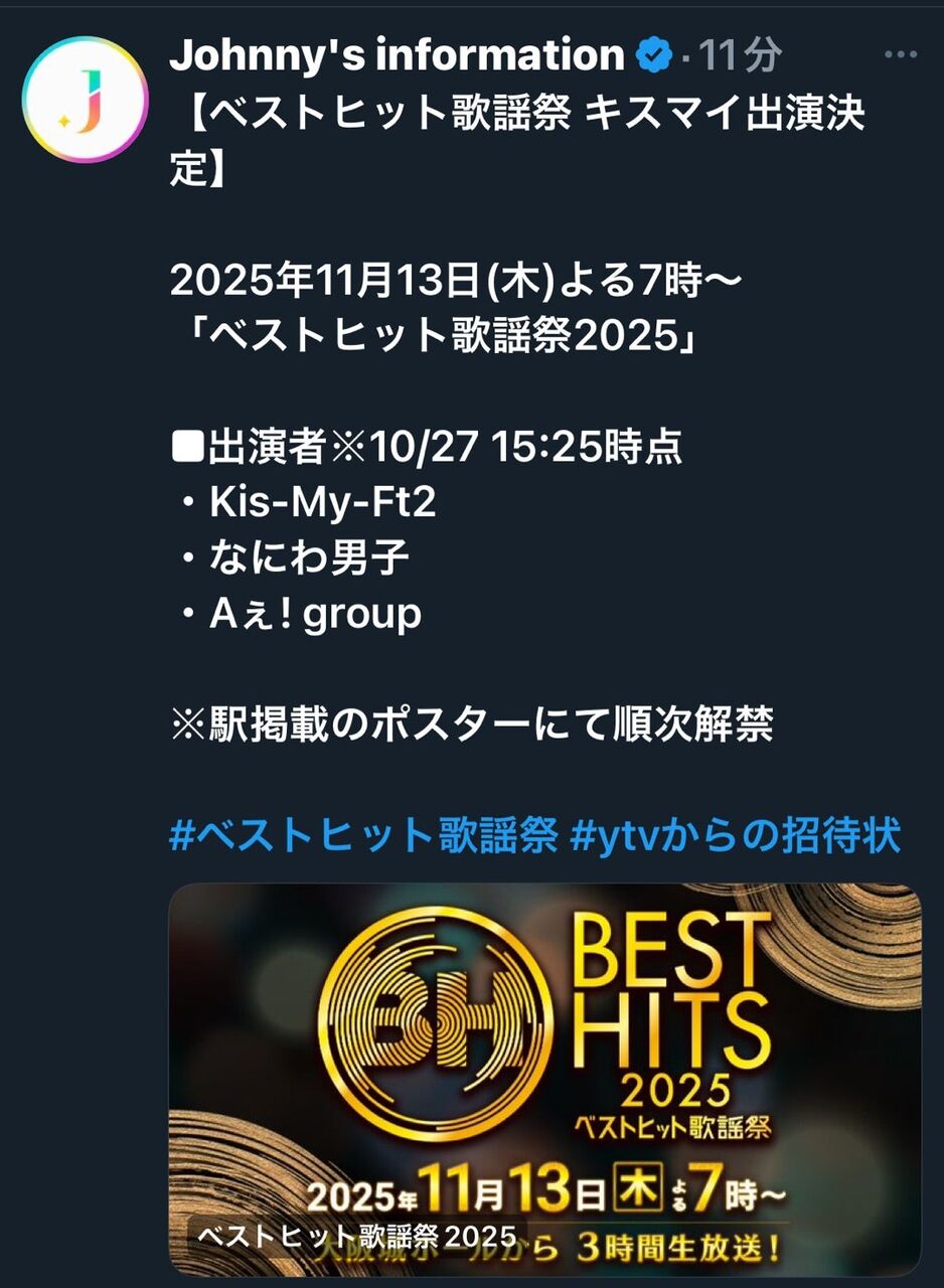 @besthitskayosai◤◢◤◢◤🎵情報解禁🎵◢◤◢◤◢ ベストヒット歌謡祭2025🎤 🎊🎉アーティスト歌唱曲 発表🎉🎊 11/13(木)よる7時から3時間生放送🕖 2025年を彩ったアーティストが 一夜限りの夢のステージをお届け🎤 ぜひフォロー&RPを! #ベストヒット歌謡祭 pic.x.com/PJbXtr1S7A