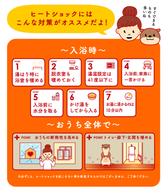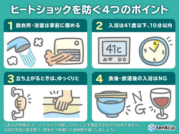 | 23日夜 東京都心など急激な寒暖差で起こる「ヒートショック」に注意 予防と対策は …一時的に血圧が下がります。体調の悪い時も、入浴は避けてください。 ヒートショック対策に「温度のバリアフリー化」を室内を暖かくするために、ホットカーペ… (出典:) |