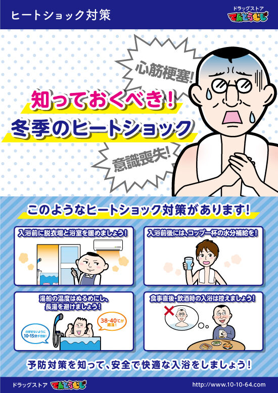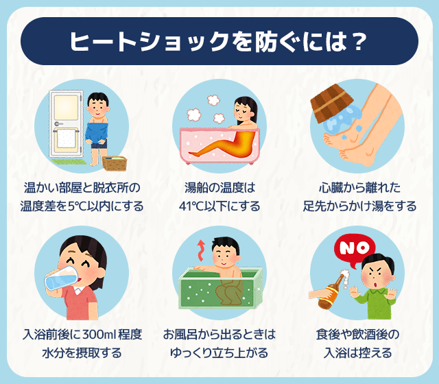 | 寒い時期に気をつけたい「ヒートショック」とは?-その特徴や対策を解説!- …くかくと、血液の粘度が増してしまうこともあります。【3】ヒートショック対策ヒートショック対策として特に「入浴中や前後の温度差」に注意して、下のようなこ… (出典:) |